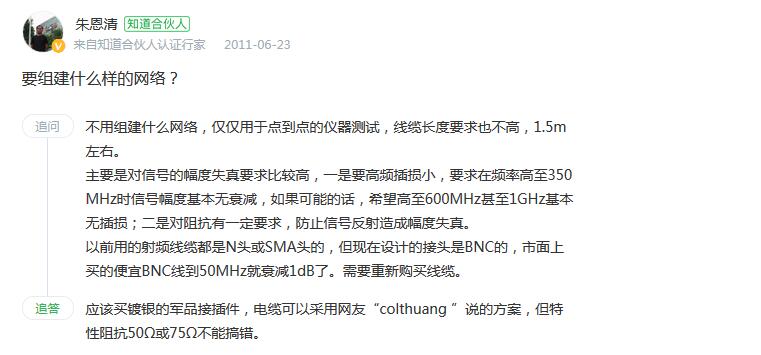 不用组建什么网络,仅仅用于点到点的仪器测试,线缆长度要求也不高,1.5m左右。主要是对信号的幅度失真要求比较高,一是要高频插损小,要求在频率高至350MHz时信号幅度基本无衰减,如果可能的话,希望高至600MHz甚至1GHz基本无插损;二是对阻抗有一定要求,防止信号反射造成幅度失真。以前用的射频线缆都是N头或SMA头的,但现在设计的接头是BNC的,市面上买的便宜BNC线到50MHz就衰减1dB了。需要重新购买线缆。