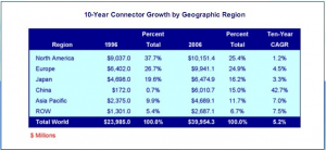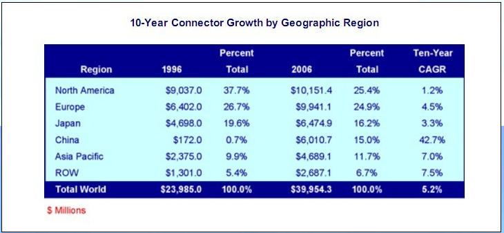 10年间中国从0.7%的连接器市场增长到15%,年增长率是42.7%,在此期间美国连接器的年增长率仅仅是1.2%. 这期间中国GDP年增长率大约是10%,电子产品制造业增长率是她的4倍.