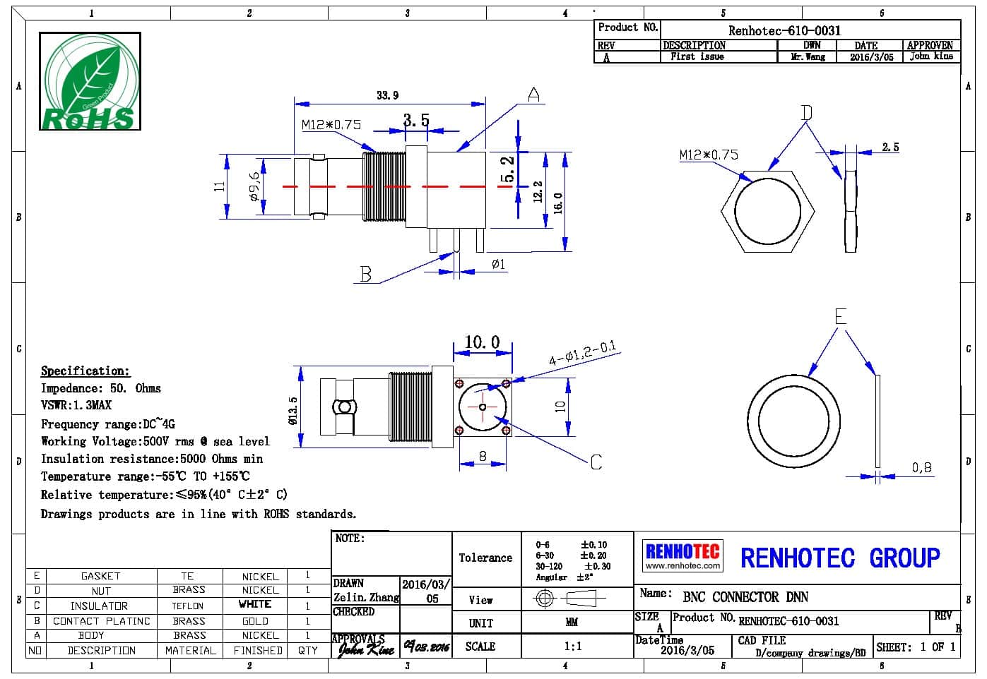 频率范围 | 50 ohm 为 0~4 GHz |