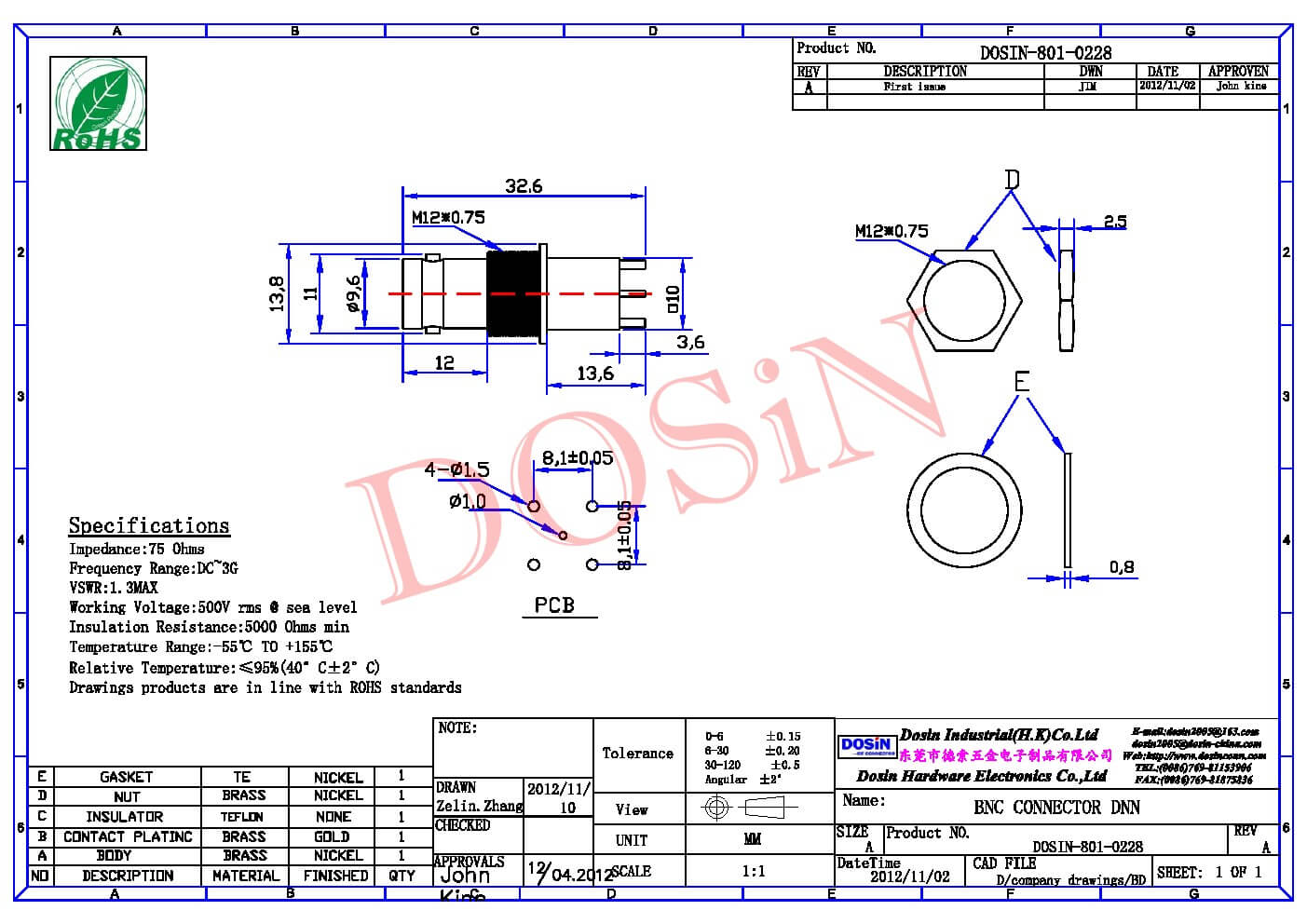 中心接触电阻 | ≦ 1.5 mΩ (Milliohms max.) |